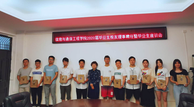 2020年6月3日下午,beat365中国官网在319会议室举行2020届毕业生校友理事聘任仪式暨毕业生座谈会。学院院长黄梦醒、党委书记蒙秋妍、党委副书记王茂钢、分管本科教学工作副院长张永辉、分管研究生工作副院长王咸鹏、电子信息工程系副主任王冠军、通信工程系副主任杨永钦、学工办主任伍庆清和27名本科、硕士毕业生代表出席会议,会议由王茂钢副书记主持。