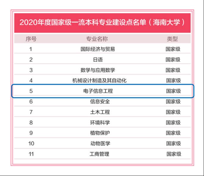 近日,根据教育部发布的《教育部办公厅关于公布2020年度国家级和省级一流本科专业建设点名单的通知》(教高厅函〔2021〕7号),beat365电子信息工程专业被教育部认定为国家级一流本科专业建设点,此举将大力推动beat365实施一流专业建设“双万计划”,将有利于人才培养能力和高等教育质量的全面提升,为服务海南自贸港建设提供重要的人才支持。