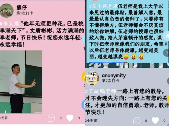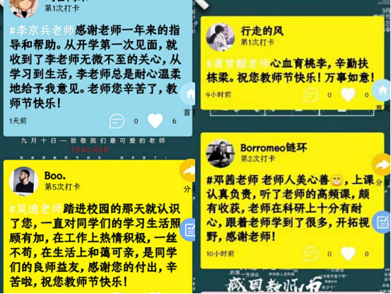 向全院学生发出"尊师重教、铭记师恩"倡议。开展“有话想对老师说——我为老师送祝福”活动,活动得到学生的积极参与,他们纷纷通过线上平台为心目中的好老师送祝福;2021级新生在军训场上录制视频表达对教师们的祝福;老生班级通过主题班会、课前敬礼问好、课后合影等形式庆祝教师节。系列活动得到广大教师的点赞。