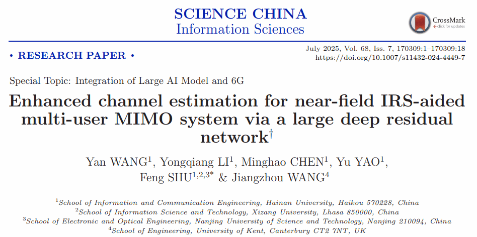 论文DOI链接:Yan Wang, Yongqiang Li, Minghao Chen, Yu Yao, Feng Shu, Jiangzhou Wang. Enhanced channel estimation for near-field IRS-aided multi-user MIMO system via a large deep residual network. Sci. China Inf. Sci. 2025, 68(7): 170309. https://doi.org/10.1007/s11432-024-4449-7