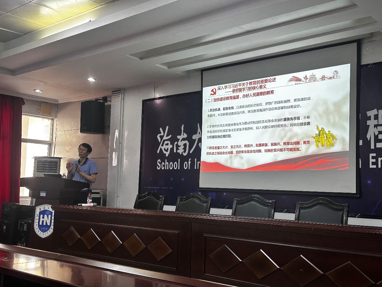 根据学习贯彻习近平新时代中国特色社会主义思想主题教育的总体安排,2023年5月18日下午,beat365中国官网党委书记黄国标以“学习贯彻习近平新时代中国特色社会主义思想,扛起 ‘为党育人、为国育才责任担当’”为题,在学院一楼报告厅为全体教职工上党课。